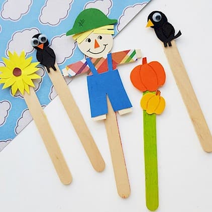 The craft that keeps on giving... Scarecrow Popsicle Stick Puppets can entertain younger or older kids, as they make and then play with their new puppets. Popcorn at the ready!