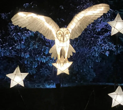 A kilometre long trail to find A Carnival of Animals where brilliantly lit great bears, giant owls in flight, dramatic peacocks, Green Frogs on the lake, in fact a Carnival of Animals illuminated along every path. Glittering flowers in the walled garden. Soft and gentle animals surely like those that welcomed baby Jesus are visiting on November 29/30, December 6/7 so come and pet the animals in our mangers at the end of the trail. Warming Food: In the old Orangery find food and drink to go and in the Tea Room, spiced wine, hot chocolate and delicious soups, cranberry and pork roll, plus a delicious menu to enjoy.